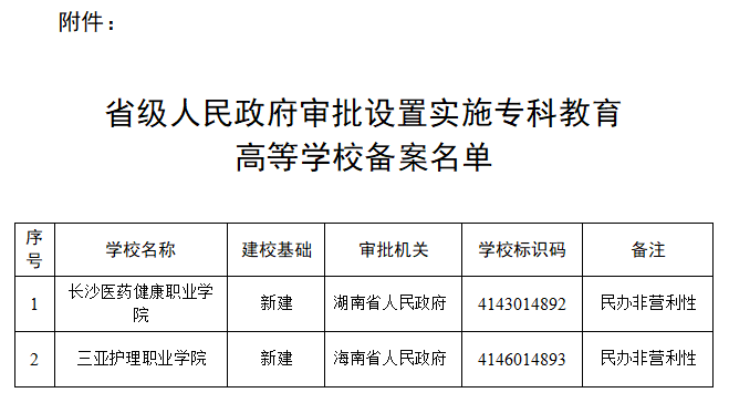 根據《中華人民共和國高等教育法》《普通高等學校設置暫行條例》等有關法律法規和政策文件的規定,現將省級人民政府審批設置的專科層次高等學校備案名單予以公布。