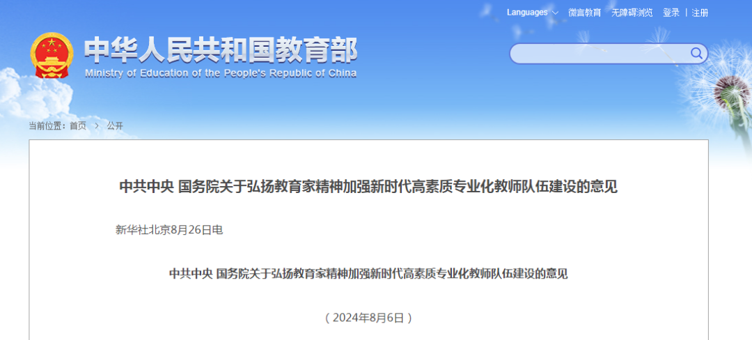 8月26日發布的《中共中央國務院關于弘揚教育家精神加強新時代高素質專業化教師隊伍建設的意見》明確提出,