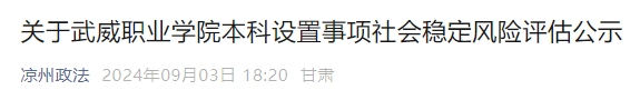 公眾號 涼州政法 消息,武威職業學院本科設置事項社會穩定風險評估公示中。