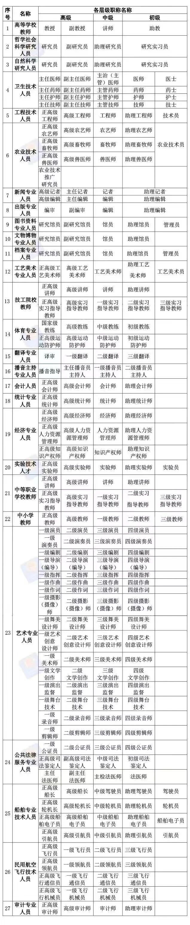 職稱評審結果一般分為高級、中級、初級三個層級,但具體到不同專業,職稱名稱又有所不同。