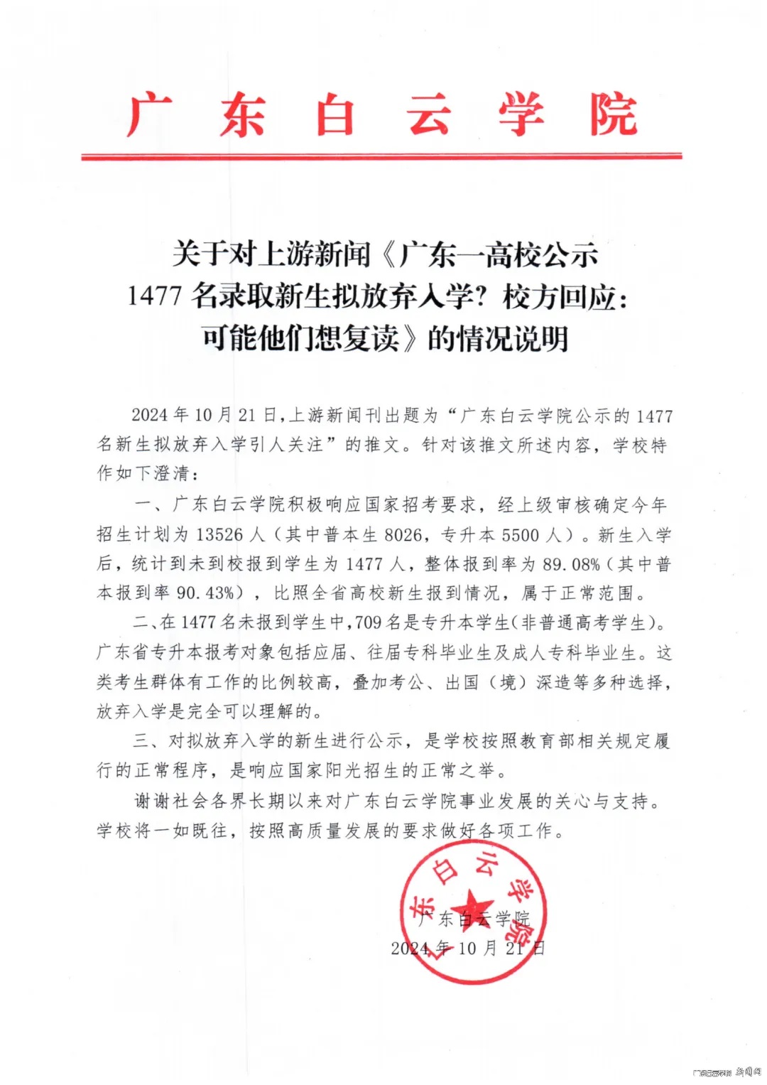 2024年10月21日,上游新聞刊出題為“廣東白云學院公示的1477名新生擬放棄入學引人關注”的推文。針對該推文所述內容,學校特作如下澄清: