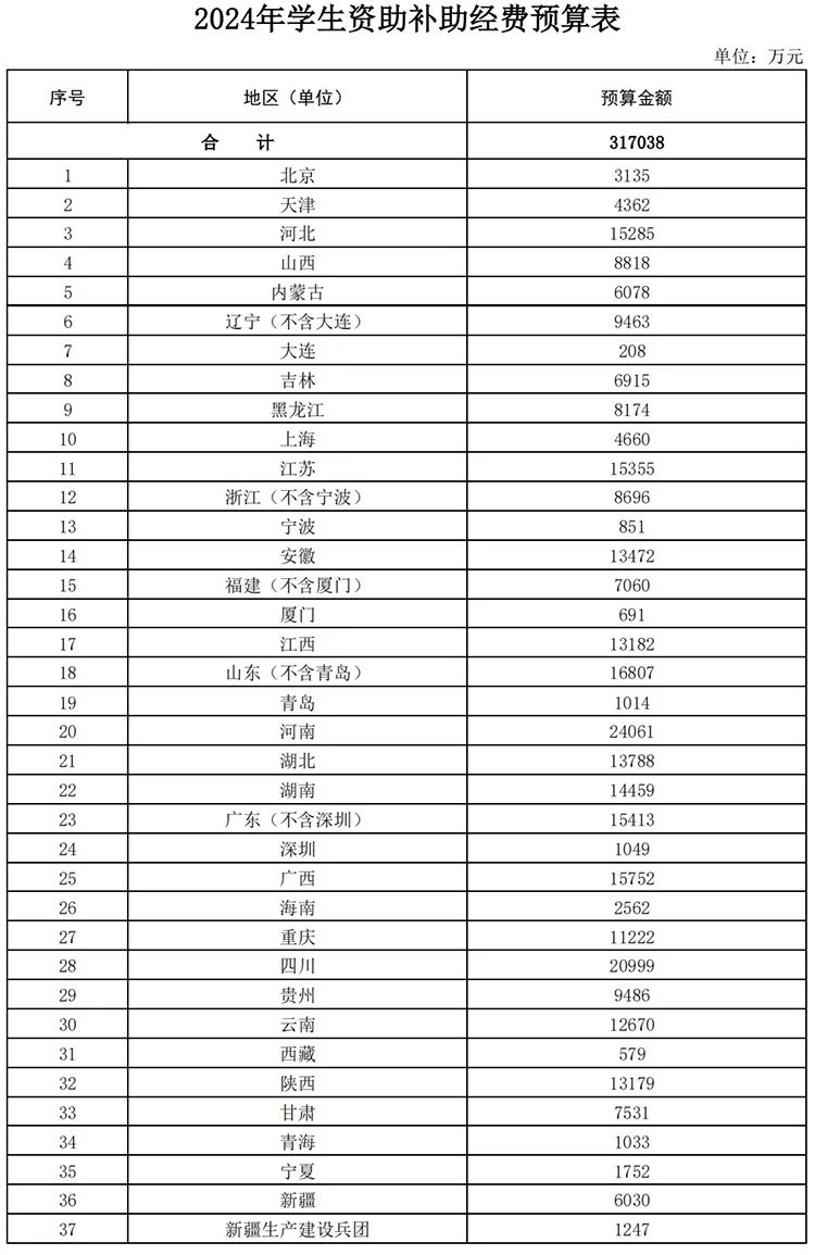 下達2024年學(xué)生資助補助經(jīng)費預(yù)算,預(yù)算總金額317038萬元。