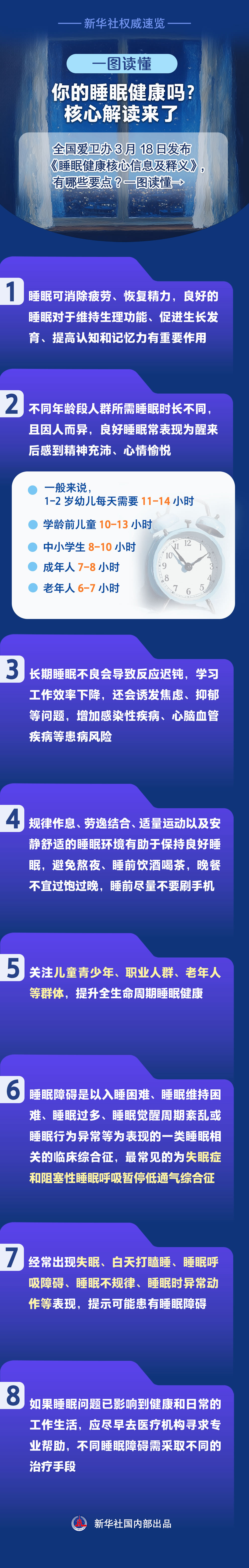 此信息及釋義提出,不同年齡段人群所需睡眠時長不同,且因人而異。一般來說,學齡前兒童每天需要10至13小時,中小學生8至10小時,成年人7至8小時,老年人6至7小時。