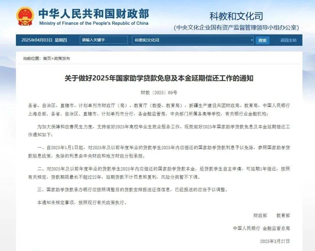 自2025年1月1日起,對2025年及以前年度畢業的貸款學生2025年內應償還的國家助學貸款利息予以免除,