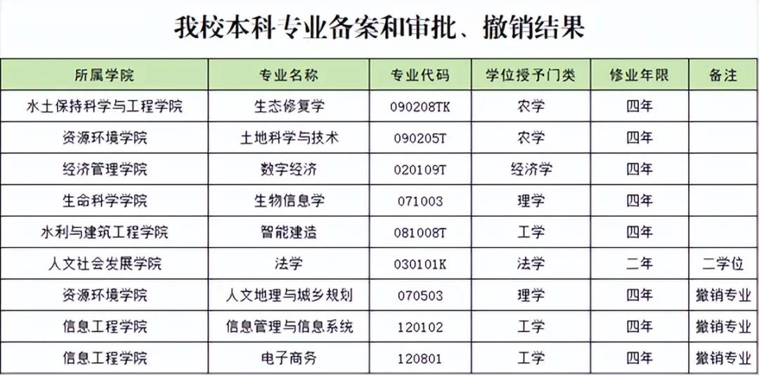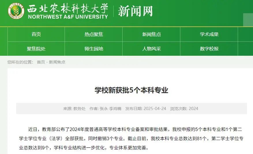 據西北農林科技大學新聞網消息,西北農林科技大學申報的5個本科專業和1個第二學士學位專業(法學)全部獲批,同時撤銷3個專業:人文地理與城鄉規劃、信息管理與信息系統、電子商務。截止目前,學校本科專業總數達到81個,第二學士學位專業總數達到9個,學科專業結構進一步優化,專業體系更加完善。