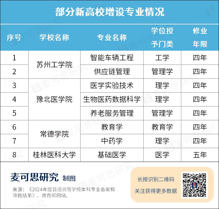 此外,對(duì)照教育部網(wǎng)站發(fā)布全國(guó)普通高等學(xué)校名單(截至2024年6月20日),我們注意到共有蘇州工學(xué)院、豫北醫(yī)學(xué)院、常德學(xué)院、桂林醫(yī)科大學(xué)等4所新高校,審批通過(guò)增設(shè)8個(gè)新專業(yè)。