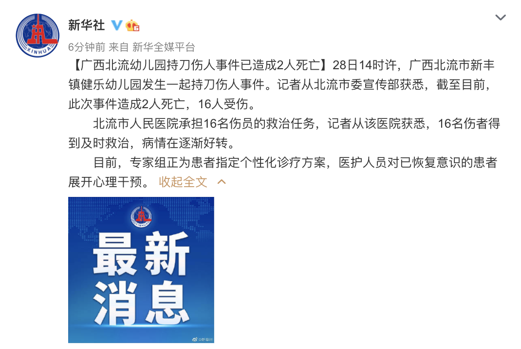 4月28日14時許,廣西北流市新豐鎮健樂幼兒園發生一起持刀傷人事件。截至29日上午,此次事件造成2人死亡,16人受傷。