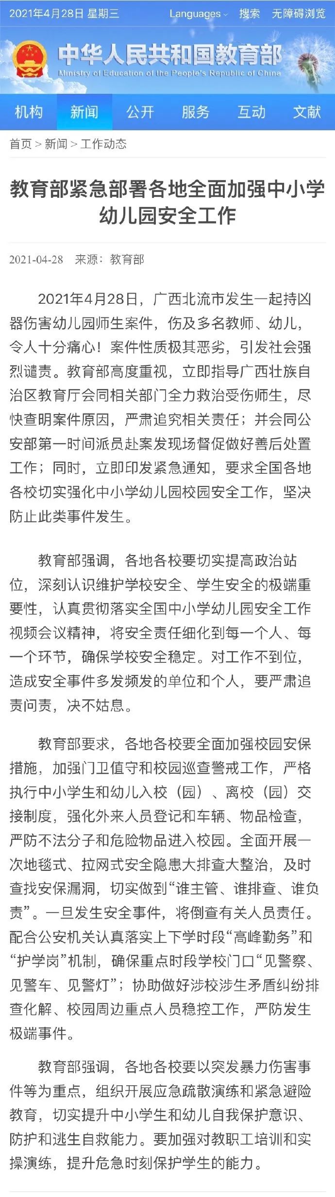 事件發生后,4月28日晚,教育部緊急部署:①要求校園強化外來人員登記檢查,嚴防不法分子和危險物品進入校園;②全面開展地毯式、拉網式安全隱患大排查大整治;③重點時段學校門口“見警察、見警車、見警燈”。