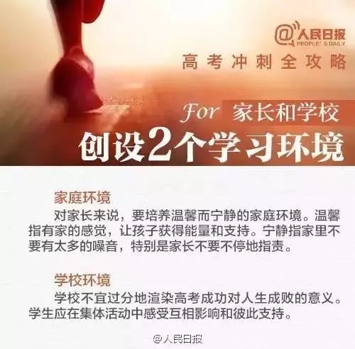 家長要調(diào)整好自己的心態(tài):平常心、平靜心、理解心、愛撫心、激勵(lì)心、信任心;高考快樂,快樂高考;尊重孩子的人格、尊重孩子的復(fù)習(xí)方式、尊重孩子的應(yīng)對(duì)策略,只要學(xué)生是對(duì)的就可以。