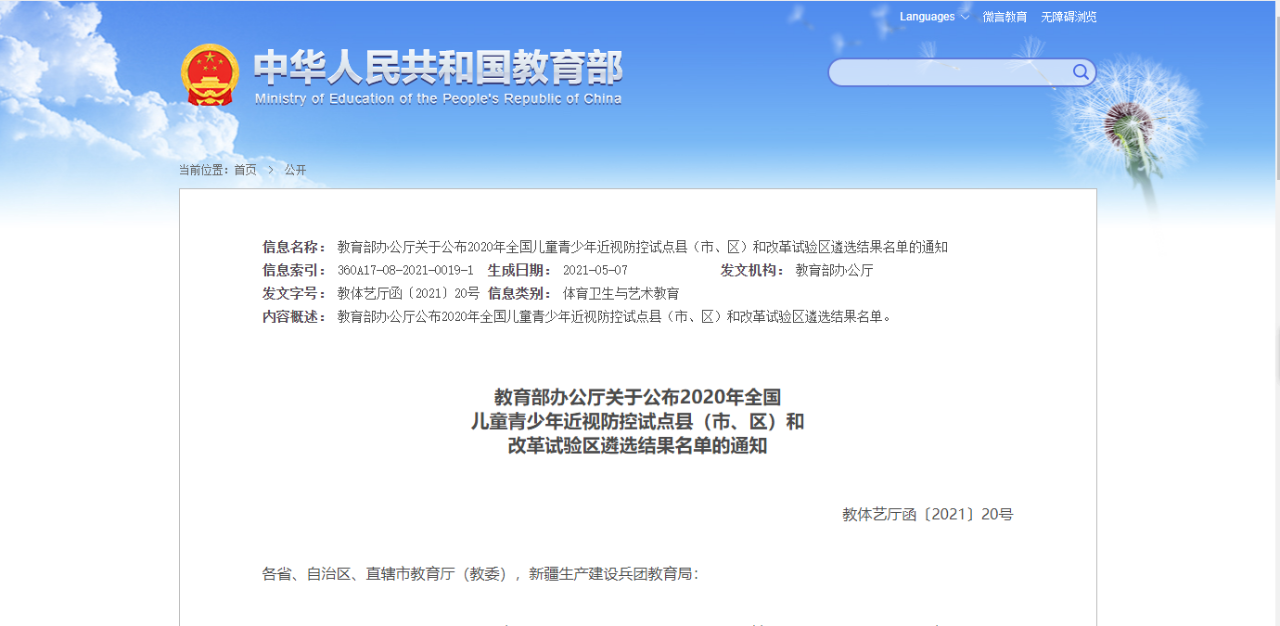 公布2020年全國兒童青少年近視防控試點縣(市、區)
