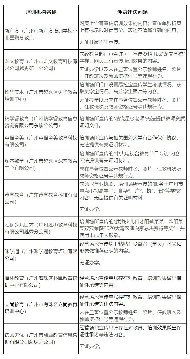 與此同時,教育部門檢查發現上述校外培訓機構中,部分機構存在無證辦學,或未在顯著位置公示教師姓名、照片、任教班次及教師資格證號的行為,依法立案處理。