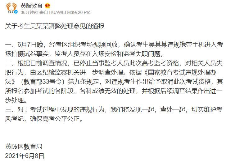 針對網(wǎng)傳湖北考生吳某某將高考數(shù)學題拍照上傳至搜題APP一事,武漢市黃陂區(qū)教育局官方微博發(fā)布通報: