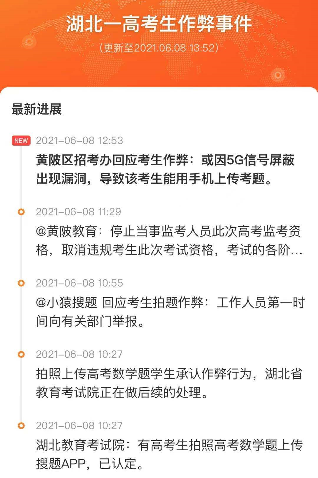6月8日,武漢市黃陂區(qū)教育局發(fā)布考生吳某某舞弊一事的情況通報,考生吳某某違規(guī)攜帶手機進考場拍攝試卷,監(jiān)考人員存在入場安檢和監(jiān)考失職。黃陂區(qū)招考辦向@緊急呼叫 回應(yīng)此事稱,或因5G信號屏蔽出現(xiàn)漏洞,導致該考生能用手機上傳考題。
