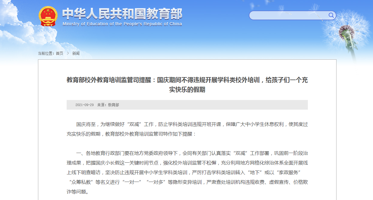 據教育部網站,國慶將至,為繼續做好“雙減”工作,防止學科類培訓違規開班開課,保障廣大中小學生休息權利,使其度過充實快樂的假期,教育部校外教育培訓監管司特作如下提醒:
