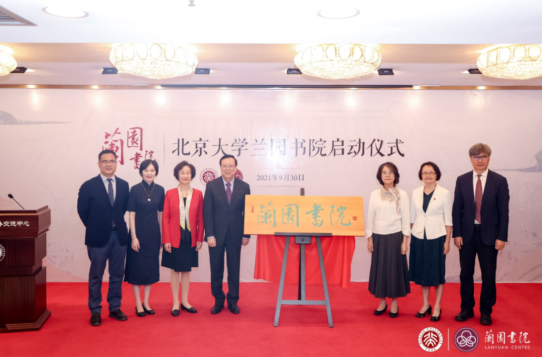 郝平、王博、柯楊、袁明、吳虹、外國(guó)語(yǔ)學(xué)院法語(yǔ)系主任董強(qiáng)教授、蘭園書院執(zhí)行院長(zhǎng)鄭如青為蘭園書院揭牌。