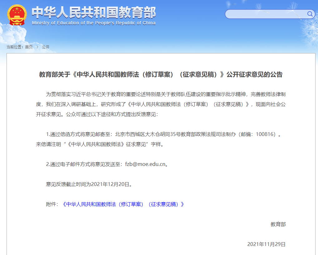 11月29日,教育部發布公告,就《中華人民共和國教師法(修訂草案)(征求意見稿)》面向社會公開征求意見。其中就有提到教師資格應當具備的相應學歷學位。