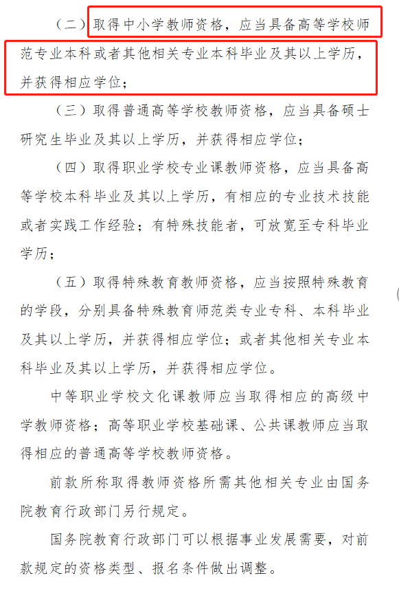 第三章資格和準入,第十六條(學歷標準)有提到取得中小學教師資格,應當具備高等學校師范專業本科或者其他相關專業本科畢業及其以上學歷,并獲得相應學位。