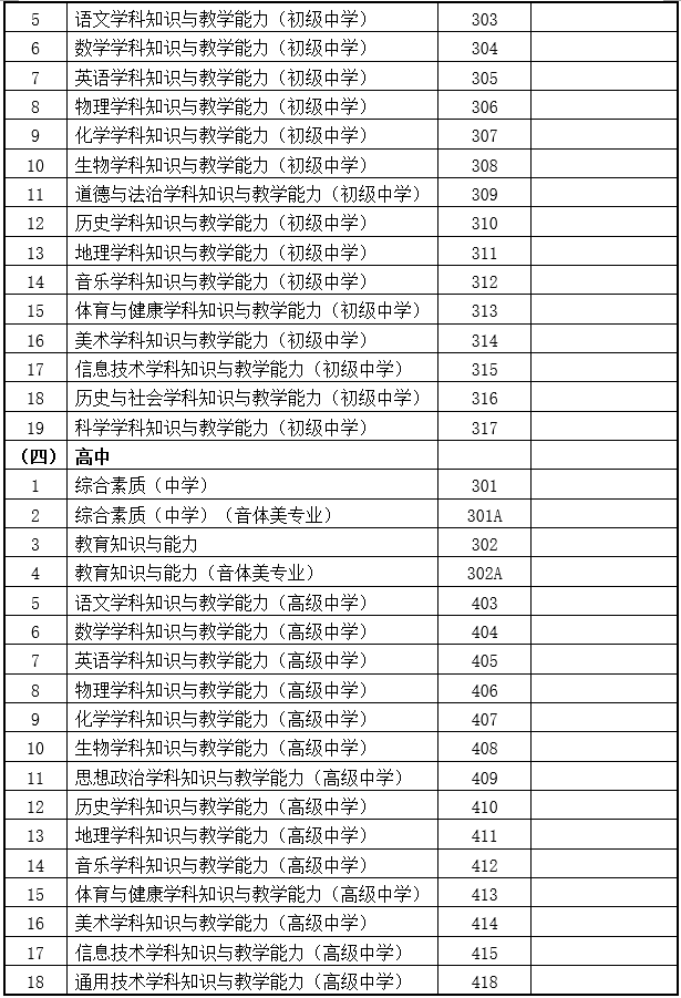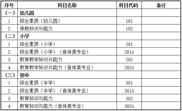 (二)為完善中小學教師資格考試制度設置,加強中小學音、體、美專業教師隊伍建設,從2017年下半年考試開始,對音、體、美專業考生的筆試公共科目一、科目二(科目代碼:201、202、301、302)實行單獨編碼(相應科目代碼:201A、202A、301A、302A),考試內容暫與原科目相同。實行單獨編碼后,音、體、美專業考生在筆試報名時應選報單獨編碼的公共科目。取得科目201A、202A合格的考生,面試僅限于參加小學類別音、體、美專業科目;取得科目301A、302A合格的考生,面試僅限于參加初中、高中、中職文化課音、體、美專業科目??忌勋@得科目201、202、301、302合格成績,可相應替代科目201A、202A、301A、302A合格成績;考生已獲得科目201A、202A、301A、302A合格成績不可替代科目201、202、301、302合格成績。