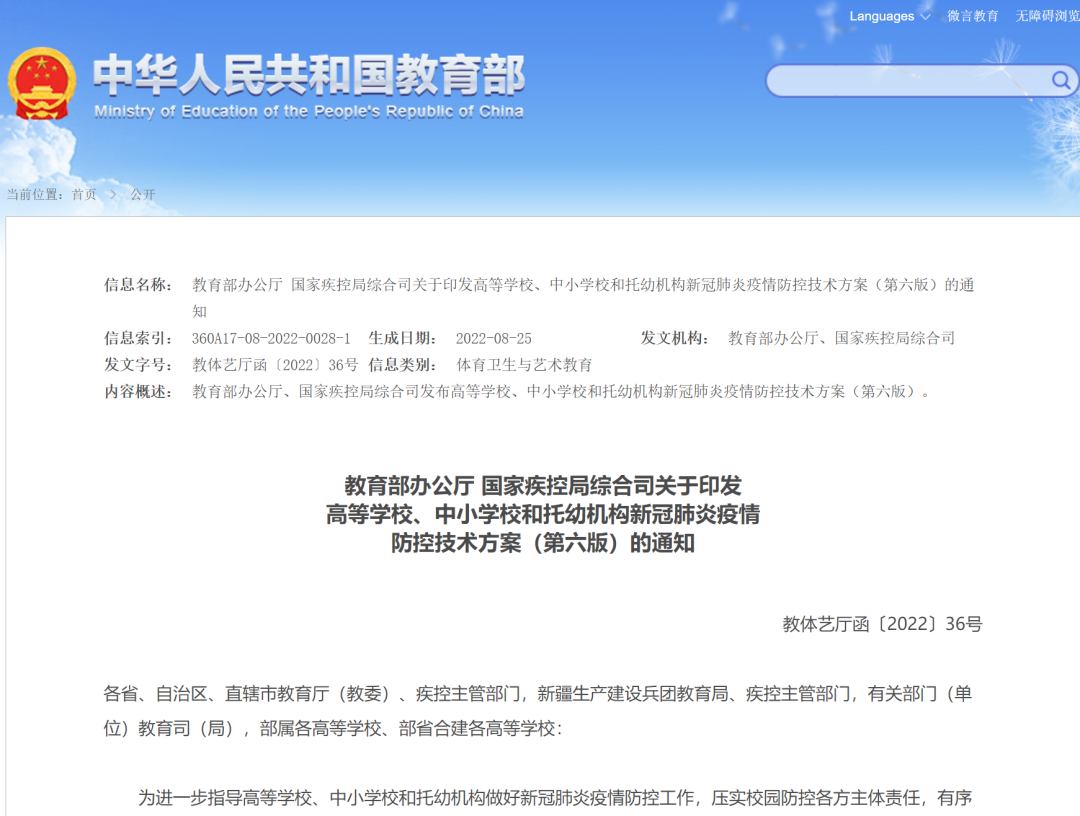 8月26日,教育部和國(guó)家疾控局聯(lián)合印發(fā)了高等學(xué)校、中小學(xué)校和托幼機(jī)構(gòu)新冠肺炎疫情防控技術(shù)方案(第六版),根據(jù)新冠肺炎疫情防控方案(第九版)要求,新版學(xué)校和托幼機(jī)構(gòu)防控方案要求各級(jí)學(xué)校做好開學(xué)前連續(xù)7天健康監(jiān)測(cè)和旅居史報(bào)告等。