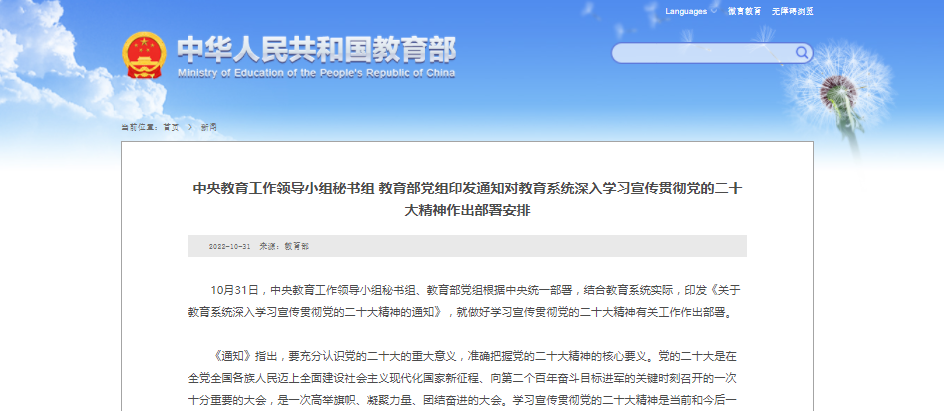 10月31日,中央教育工作領(lǐng)導(dǎo)小組秘書(shū)組、教育部黨組根據(jù)中央統(tǒng)一部署,結(jié)合教育系統(tǒng)實(shí)際,印發(fā)《關(guān)于教育系統(tǒng)深入學(xué)習(xí)宣傳貫徹黨的二十大精神的通知》,就做好學(xué)習(xí)宣傳貫徹黨的二十大精神有關(guān)工作作出部署。