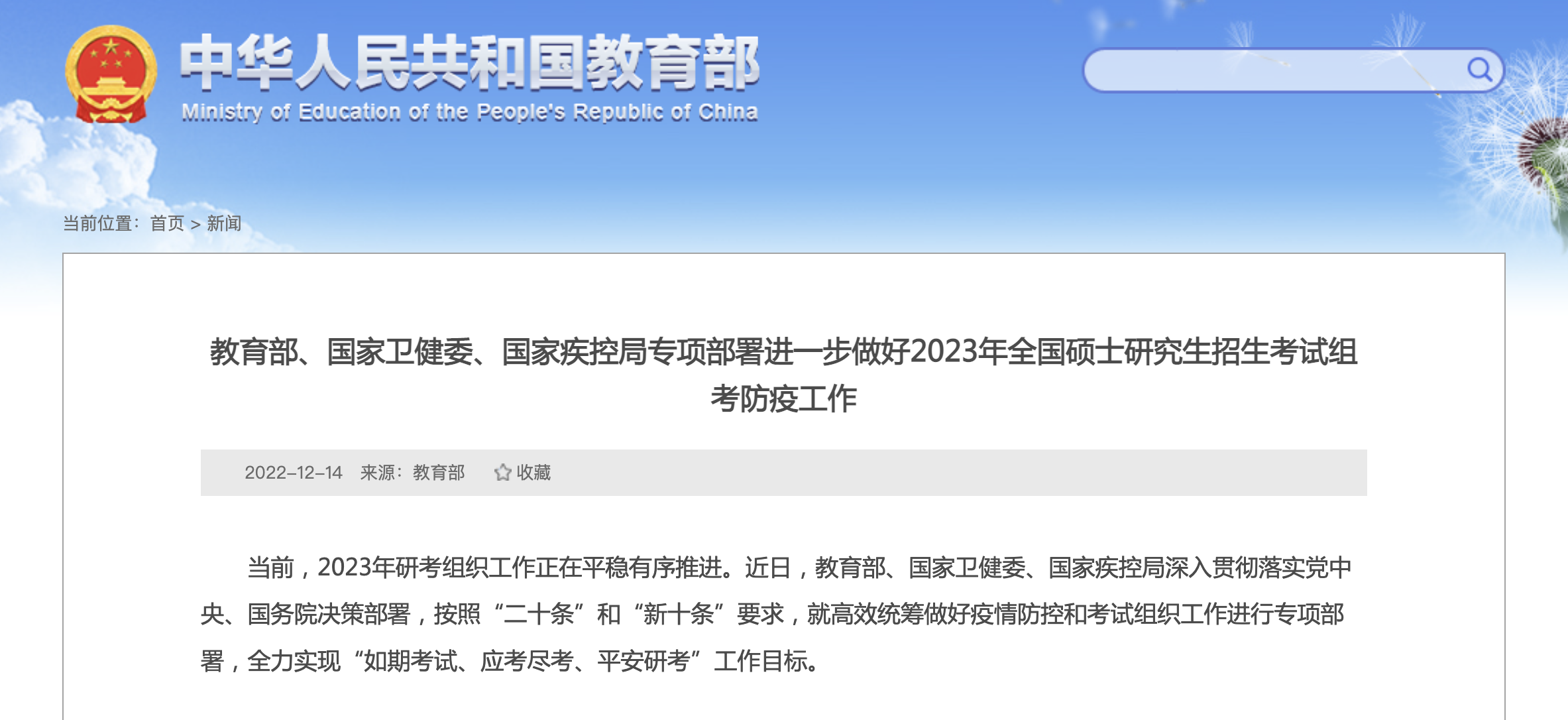 教育部、國家衛健委、國家疾控局專項部署進一步做好2023年全國碩士研究生招生考試組考防疫工作