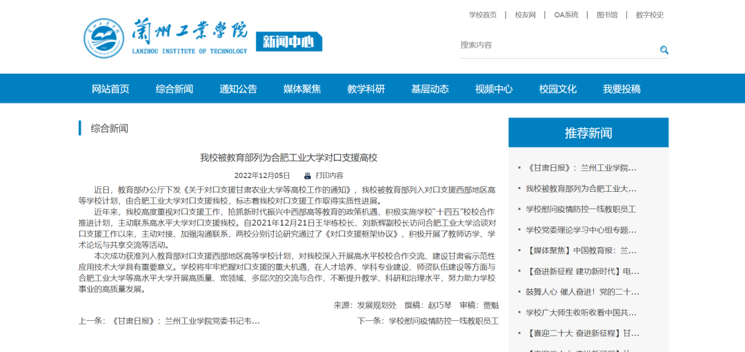 12月5日,蘭州工業學院也在其官網發布消息稱:“我校被教育部列入對口支援西部地區高等學校計劃,由合肥工業大學對口支援我校,標志著我校對口支援工作取得實質性進展。”