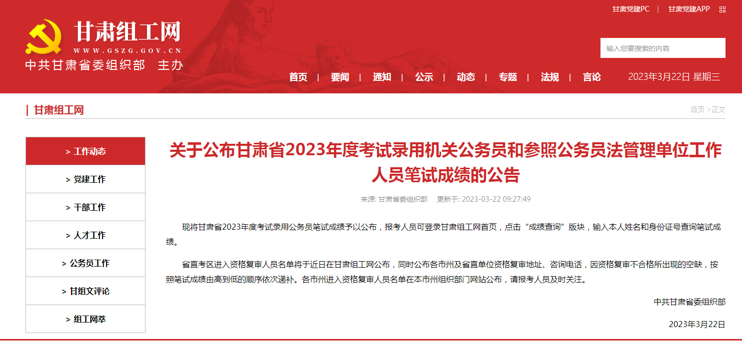 省直考區進入資格復審人員名單將于近日在甘肅組工網公布,同時公布各市州及省直單位資格復審地址、咨詢電話,因資格復審不合格所出現的空缺,按照筆試成績由高到低的順序依次遞補。各市州進入資格復審人員名單在本市州組織部門網站公布,請報考人員及時關注。